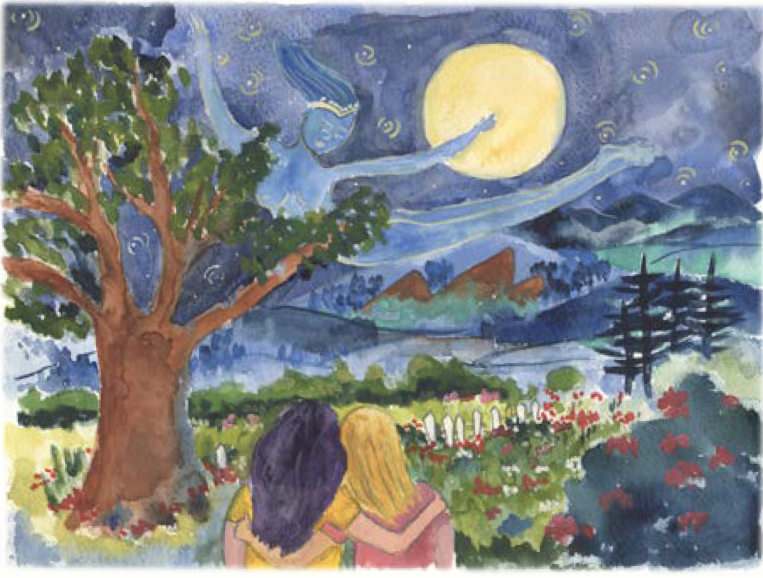 I’ll be visiting Dad soon (we kind of made up, but not really) and I should be super excited about everything, but most nights I don’t even think about Mom, Dad or a new school. I usually lie awake, staring up at the ceiling. Praying to whoever’s listening to please bring me a best friend forever. A companion who checks out my website and is overwhelmed. And the first thing she says is, “Oh my God Alice- you’re describing me!” A soulmate who listens deeply to music and the outdoors: who listens to me the way I listen to her. She whispers, “I want to explore enchanted woods and haunted lakes with you.” We’ll go shopping, or find a place to enjoy afternoon tea and split desert, then kiss goodbye, or go to my backyard and sit close to each other in Mom’s magical garden- while my soul angel, our soul angel hovers above us, smiling as she watches over us.